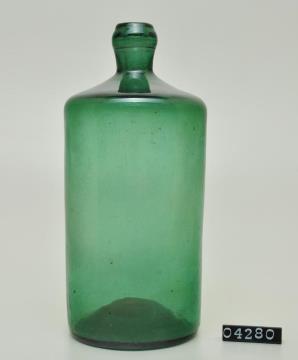 Runde, grüne Enghalsflasche mit flacher Schulter und verdickter Mündung. Hochgestochener Boden mit ovalem Hefteisenabriss. Unsigniert.