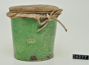 Runder, grün glasierter konischer Topf aus Keramik mit Binderand und signierter Papiertektur.