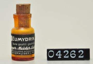 Rundes, hellbraunes Weithalsfläschchen mit Korkstopfen und Resten der Paraffinversiegelung am Flaschenhals. Etikettiert.