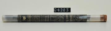 Rundes, langes rohrförmiges, farbloses zylindrische Glasgefäß mit Korkstopfen und Paraffinversiegelung. Etikettiert.