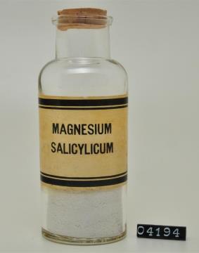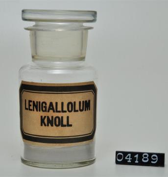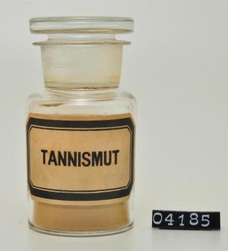 Rundes, farbloses Pulverglas mit Korkstopfen. Zylindrischer Flaschenkörper mit runder Schulter und kurzem Zylinderhals mit verstärktem Rand. Schwarz signiert. Rückseite originaletikett der Firma Merck