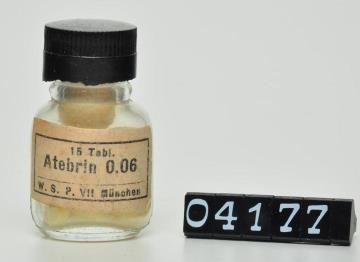 Rundes farbloses Enghalsfläschchen mit Kork, originaler grüner Metalltektur mit Firmenlogo und Banderole. Maschinell hergestellt. Signiert.