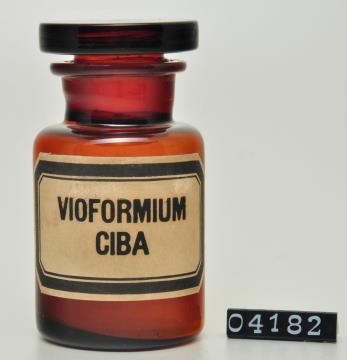Rundes, braunes Pulverglas mit Schliffstopfen (Hohlstopfen). Ausgebogener, abgeflachter Mündungsrand. Schwarz signiert.