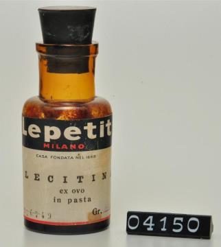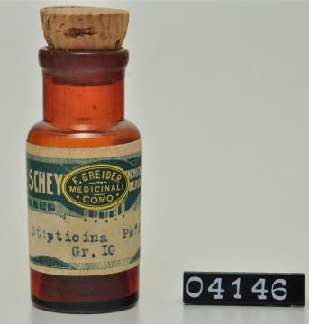 braunes rundes Weithalsglas, mit Glasstopfen. Flache Schulter. Maschinell hergestellt. Paraffinreste an Glasstopfen und Mündung. Signiert. Rückseite handschriftliche Preisangabe: Privat. Preis 10 Sück Lire 6.- ...Preis 10 Stück Lire 5.- ... 100 stück L. 45.-