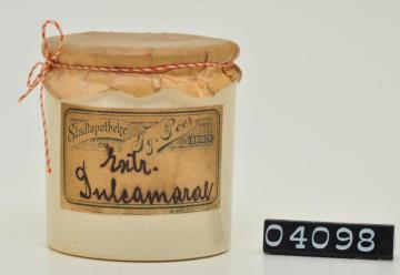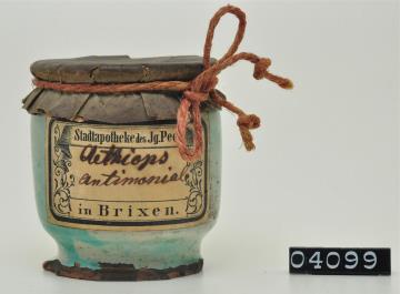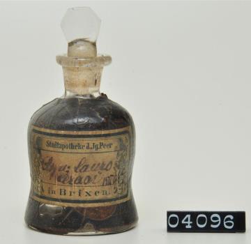 Zylinderförmige Enghalsflasche mit eingeschliffenem Griffstopfen (Massivstopfen) aus farblosem Glas und Hefteisenabriss. Vollständig mit schwarzem Papier überklebt (Lichtschutz). Vorder und Rückseite etikettiert.