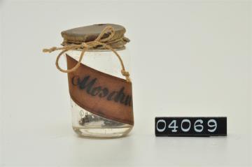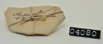 Graues Papierpäckchen mit Schnur zugebunden. Beinhaltet gepulverte Kräuterdroge. Papier von einem Buchhaltungsjournal(?)