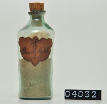 Runde, hellgrüne Enghalsflasche mit Korkstopfen und Tektur mit Faden zugebunden. Hochgestochener Boden mit rundem Hefteisenabriss. Etikettiert und signiert.