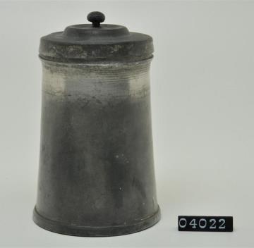 Konische Zinnbüchse mit Stülpdeckelrand und flachem Stülpdeckel mit massivem Knauf. Signaturstreifen zum Auswechseln. Signatur nicht lesbar.