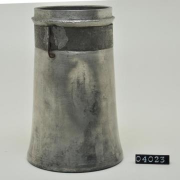Kleine konische Zinnbüchse mit Halterung für Beschriftung und Stülpdeckelrand, ohne Deckel. Schildförmiges Blechetikett zum Aufstecken.