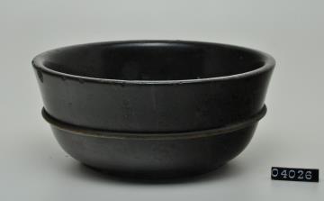 Reibschale aus Serpentin mit Metallring an der Wandung zur Verstärkung. Leicht abgesetzter Fuß, glatter Boden.