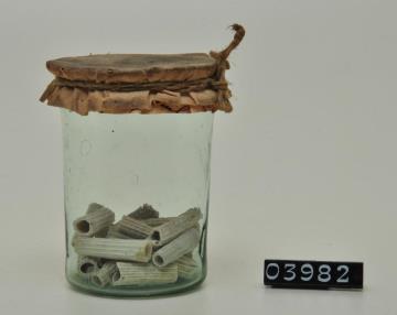 Kleines, rundes Weithals-Bindeglas aus farblosem Glas mit Rezeptfahne. Hochgestochener Boden mit Hefteisenabriss.