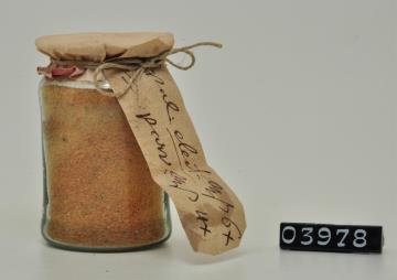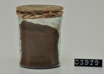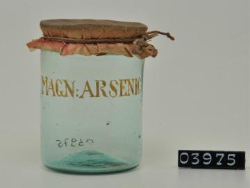 Kleines, rundes Weithals-Bindeglas aus farblosem Glas mit beschrifteter Tektur. Hochgestochener Boden mit Hefteisenabriss.