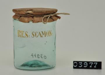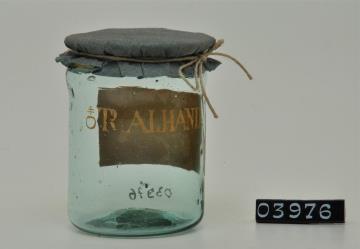 Kleines, rundes Weithals-Bindeglas aus grünlichem Glas mit Goldschrift und Tektur. Hochgestochener Boden mit Hefteisenabriss.