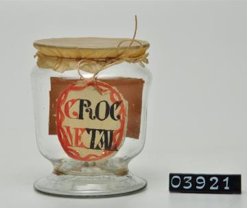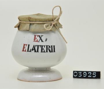 Fayance-Standgefäß; Topfform mit fast kugelartiger Grundform; enger Halsansatz, relativ flacher, breiter Gefäßfuß, hohle konvexe Form; Inschrift in rot-schwarzer Kaltmalerei, roter Anfangsbuchstabe. Mit Tektur und Bindfaden verschlossen.