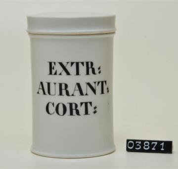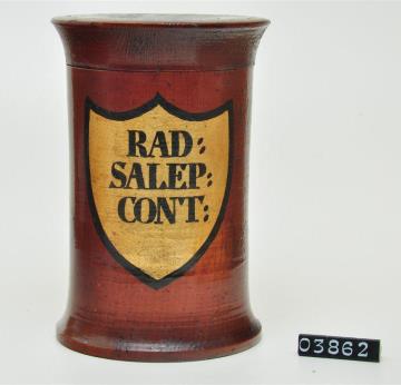 Braune, zylinderförmige gedrechselte Holzdose (Holzbüchse) mit ausgestelltem Standfuß und eingepaßtem, flachem Stülpdeckel mit nach außen gebogenem Profil. Auf der Schauseite schildförmiges und goldfarbenes Beschriftungsfeld mit schwarzem Rand. Schwarz signiert. Enthält geschnittene Rhabarberwurzel.