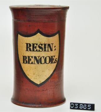 Braune, zylinderförmige gedrechselte Holzdose (Holzbüchse) mit ausgestelltem Standfuß und eingepaßtem, flachem Stülpdeckel und nach außen gebogenem Profil. Auf der Schauseite schildförmiges und goldfarbenes Beschriftungsfeld mit schwarzem Rand. Schwarz signiert. Enthält grob gepulverte Räuchermischung.