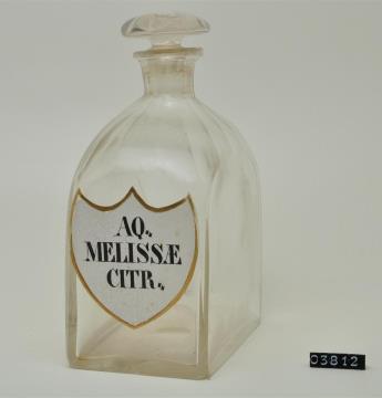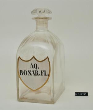 Farblose Vierkantflasche mit Stopfen und Hefteisenabriss. Bis zum Halsansatz überstochen. Unregelmäßig ausgebogener, leicht verdickter Mündungsrand. Schulter, Hals, Stopfen, Seiten, Kanten und Boden geschliffen und poliert. Eingebranntes, weißes Emailleschild in der Form eines Schweizer Schildes mit goldenem Rand. Schwarz signiert. Enthielt Rosenwasser.