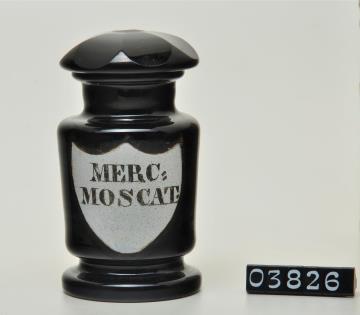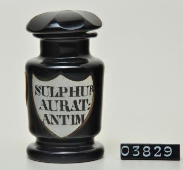 Schwarzes, rundes Pulverglas (Hyalithglas = siehe Bemerkungen) mit Schliffstopfen (Massivstopfen) mit Facettenschliff. Fuß mit Hefteisenabriss und nachgeschliffenem Boden. Ausladender, flacher Mündungsrand. Eingebranntes, weißes Emailleschild in der Form eines Schweizer Schildes mit goldenem Rand. Schwarz signiert.