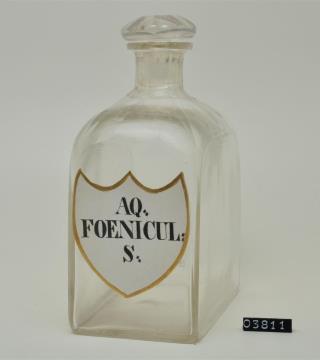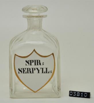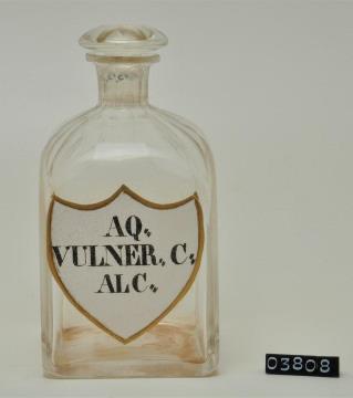 Farblose Vierkantflasche mit Stopfen, Hefteisenabriss weggeschliffen. Bis zum Halsansatz überstochen. Unregelmäßig ausgebogener, leicht verdickter Mündungsrand. Schulter, Hals, Stopfen, Seiten, Kanten und Boden geschliffen und poliert. Eingebranntes, weißes Emailleschild in der Form eines Schweizer Schildes mit goldenem Rand. Signiert.