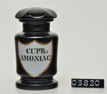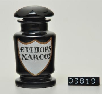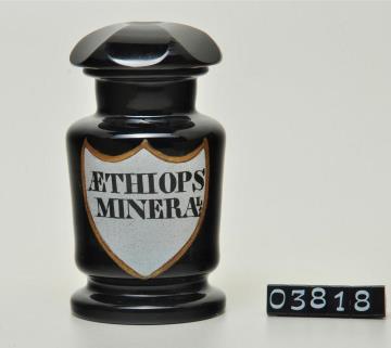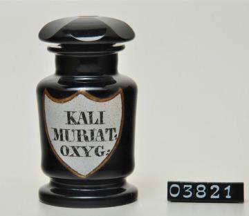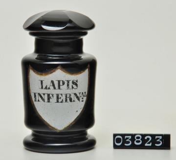 Schwarzes, rundes Pulverglas (Hyalithglas = siehe Bemerkungen) mit Schliffstopfen (Massivstopfen) mit Facettenschliff. Fuß mit Hefteisenabriss und nachgeschliffenem Boden. Ausladender, flacher Mündungsrand. Eingebranntes, weißes Emailleschild in der Form eines Schweizer Schildes mit goldenem Rand. Schwarz signiert.