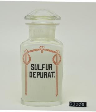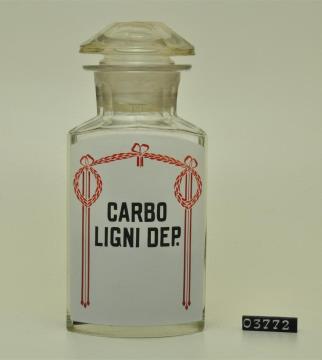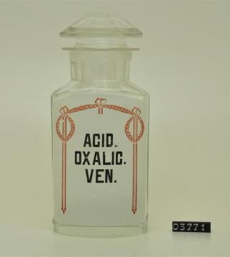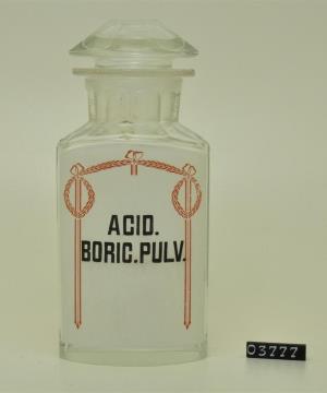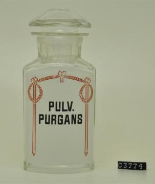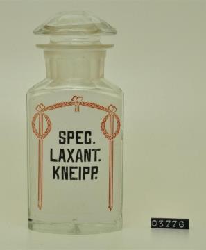 Ovalgriffiges, halb geschliffenes, farbloses Pulverglas. Schliffstopfen mit ringförmigem Hefteisenabriss. Schulter, Hals, Stopfen und Boden geschliffen und poliert. Eingebranntes, weißes Emailleschild über die gesamte Vorderwand mit jugendstilähnlicher, rotbrauner Randdekoration (Blattgirlande mit Bändern). Schwarz signiert.