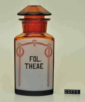 Ovalgriffiges, halb geschliffenes, braunes Pulverglas. Schliffstopfen mit ringförmigem Hefteisenabriss. Schulter, Hals, Stopfen und Boden geschliffen und poliert. Eingebranntes, weißes Emailleschild über die gesamte Vorderwand mit jugendstilähnlicher, rotbrauner Randdekoration (Blattgirlande mit Bändern). Schwarz signiert.