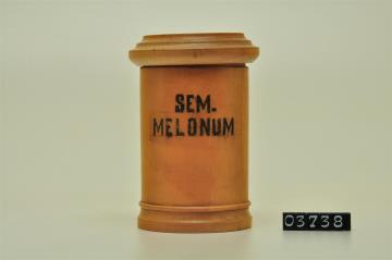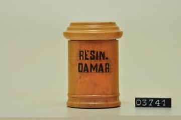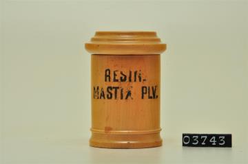 Hellbraune, zylinderförmige Holzdose (Holzbüchse) mit abgesetztem Standfuß bestehend aus Halbrundstab, Kehlung und geradem Abschluss. Flacher Stülpdeckel mit gerundetem Deckelrand und darüber zwei Kehlungen. Schwarz signiert. Enhält noch wenig Mastixpulver