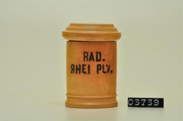 Hellbraune, zylinderförmige Holzdose (Holzbüchse) mit abgesetztem Standfuß bestehend aus Halbrundstab, Kehlung und geradem Abschluss. Flacher Stülpdeckel mit gerundetem Deckelrand und darüber zwei Kehlungen. Schwarz signiert. Enthält Reste von Mastixharz.