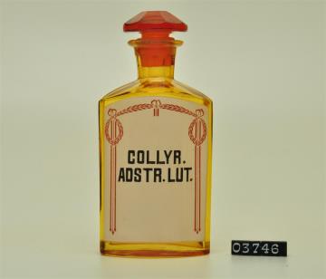Ovalgriffige, halb geschliffene, farblose Standflasche. Schulter, Hals, Stopfen und Boden geschliffen und poliert. Eingebranntes, weißes Emailleschild über die gesamte Vorderwand mit jugendstilähnlicher, rotbrauner Randdekoration (Blattgirlande mit Bändern). Schwarz signiert.
