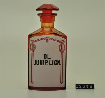 Ovalgriffige, halb geschliffene, braune Standflasche. Schulter, Hals, Stopfen und Boden geschliffen und poliert. Eingebranntes, weißes Emailleschild über die gesamte Vorderwand mit jugendstilähnlicher, rotbrauner Randdekoration (Blattgirlande mit Bändern). Schwarz signiert.