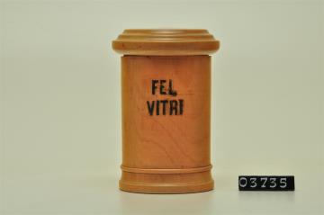 Hellbraune, zylinderförmige Holzdose (Holzbüchse) mit abgesetztem Standfuß bestehend aus Halbrundstab, Kehlung und geradem Abschluss. Flacher Stülpdeckel mit gerundetem Deckelrand und darüber zwei Kehlungen. Schwarz signiert