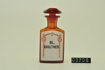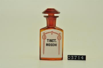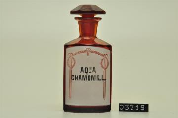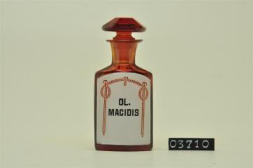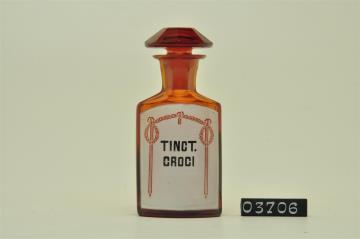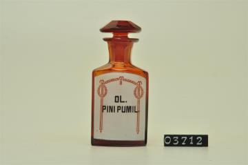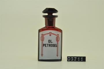 Ovalgriffige, halb geschliffene Standflasche aus braunem Kristallglas. Schulter, Hals, Boden und Stopfen geschliffen und poliert. Eingebranntes, weißes Emailleschild über die gesamte Vorderwand mit jugendstilähnlicher, rotbrauner Randdekoration (Blattgirlande mit Bändern). Signiert.