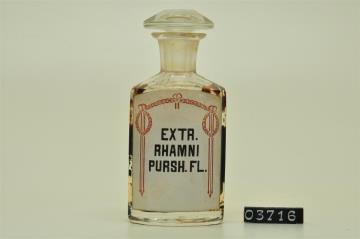 Ovalgriffige, halb geschliffene Standflasche aus farblosem Kristallglas. Schulter, Hals, Boden und Stopfen geschliffen und poliert. Eingebranntes, weißes Emailleschild über die gesamte Vorderwand mit jugendstilähnlicher, rotbrauner Randdekoration (Blattgirlande mit Bändern). Signiert.