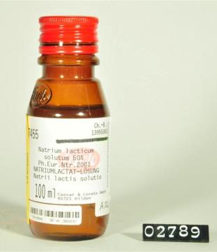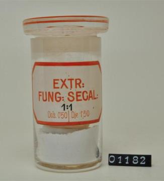 Zylinderförmiges Extraktgefäß aus farblosem Glas, mit signiertem offenem Schliffstopfen und eingebranntem, achteckigen Emailleschild: einfacher roter Rand, rote Schrift mit Maximaldosenangabe. Im Gefäß zylinderförmiges Einsatzglas zur Aufnahme des Extraktes mit eingebrannter, farbloser Emaillelesignatur auf weißem Grund. Das Einsatzglas steht auf einer gelochten Porzellanplatte, darunter eine Schicht ungelöschten Kalkes. Rot signiert.