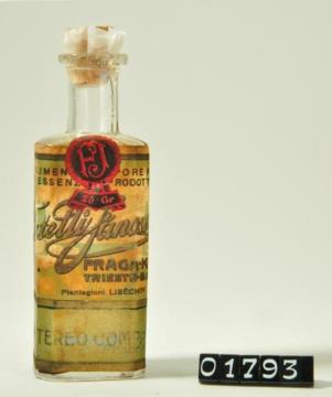 Achteckige Enghalsflasche aus farblosem Glas und Stopfen. Verdickter, flacher Mündungsrand. Etikettiert