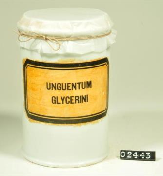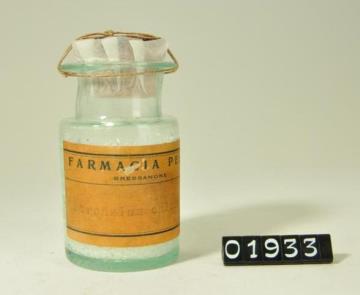 Rundes, farbloses Pulverglas mit Schliffstopfen. Hohlstopfen mit Hefteisenabriss. Ausladender Mündungsrand. Handschriftlich signiert. Etikett der Farmacia Peer, Bressanone.