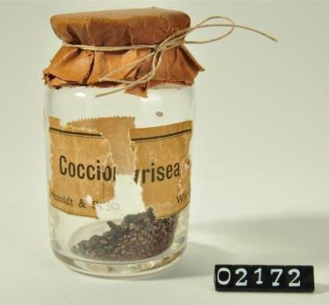 Rundes, braunes Pulverglas mit Stopfen. Verdickter, abgeflachter Mündungsrand. Handschriftlich mit schwarzer Tinte auf einem Etikett der Stadtapotheke Peer signiert.