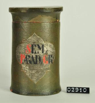 Olivgrüne, zylinderförmige Holzdose (Holzbüchse) mit ausgestelltem Standfuß und eingepaßtem, flachem Stülpdeckel mit nach außen gebogenem Profil. Auf der Schauseite ausgespartes, geschwungenes Beschriftungsfeld mit Resten von Silberfarbe. Rot und schwarz signiert. Enthält Paradieskörner.
