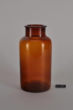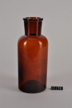 Brauner, zylindrischer Flaschenkörper, maschinell hergestellt, mit runder Schulter und nach unten sich konisch verengendem Hals mit Schraubgewinde. Seitennaht. Mit Bodenprägung.