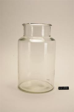 Runde Weithalsflasche; farbloses Glas, unregelmäßig ausgebogener, leicht verdickter Mündungsrand