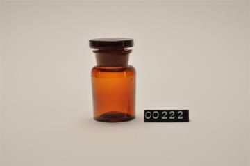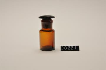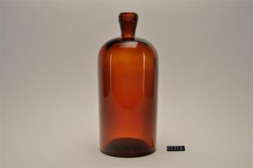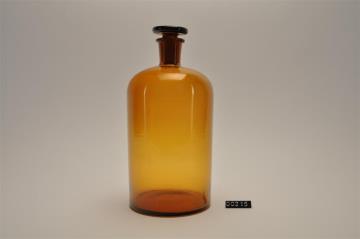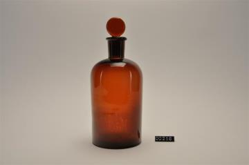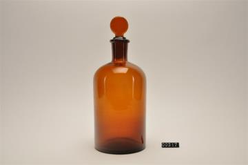 Runde Enghalsglasflasche mit Schliffstopfen. Braunes Glas.