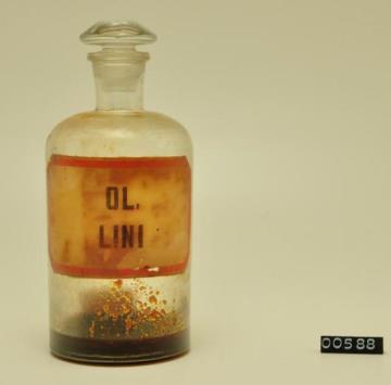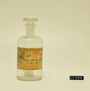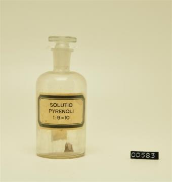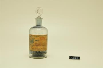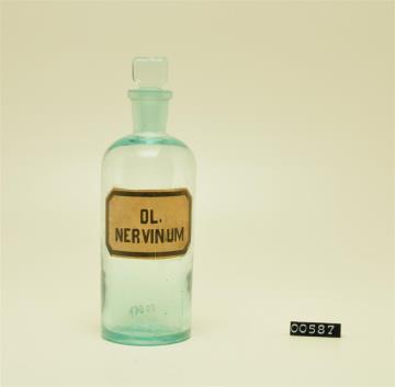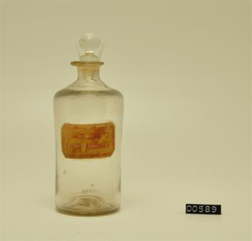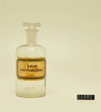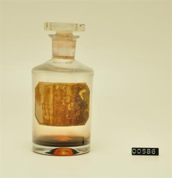 Runde, farblose Enghalsflasche mit Schliffstopfen. Abgeflachter Mündungsrand. Etikettiert