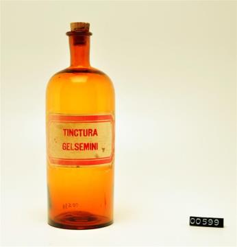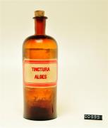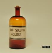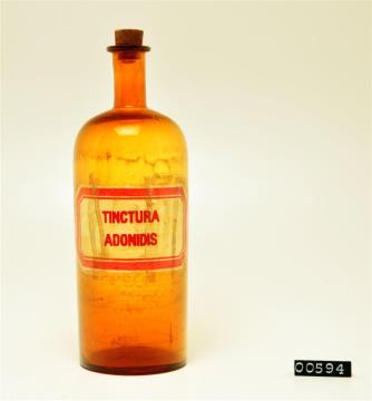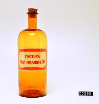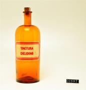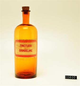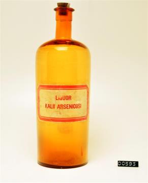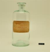 Runde, braune Enghalsflasche mit Korkstopfen. Maschinell hergestellt, aufgesetzte Mündung. Mit Signierapparat bedrucktes Papierschild, achteckig, mit rotem Doppelrand und roter Schrift auf weißem Grund. Mit Schilderlack überzogen. Signiert.