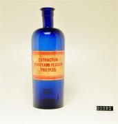 Runde, blaue Enghalsflasche ohne Stopfen. Maschinell hergestellt mit aufgesetzter Mündung. Mit Signierapparat bedrucktes Papierschild, achteckig, mit rotem Doppelrand und roter Schrift auf weißem Grund. Mit Schilderlack überzogen. Signiert.