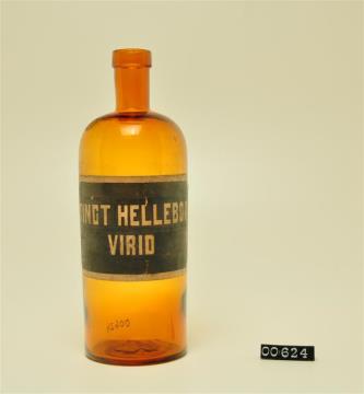 Runde, braune Tropfflasche mit herzförmigen Schliffstopfen. Ausgebogener Mündungsrand mit Ausguss. Etikettiert.