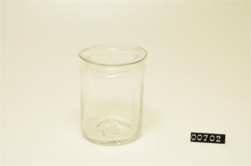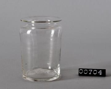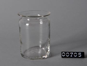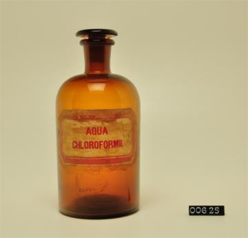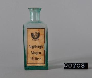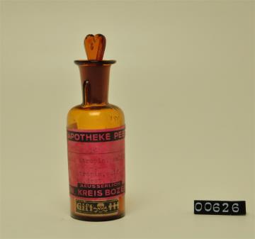 Runde, braune Enghalsflasche mit Schliffstopfen. Maschinell hergestellt. Abgeflachte Schulter. Mündungsrand mit umgelegtem Glasfaden. Mit Signierapparat bedrucktes Papierschild, achteckig, mit rotem Doppelrand und roter Schrift auf weißem Grund. Mit Schilderlack überzogen. Signiert.