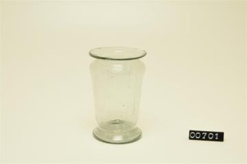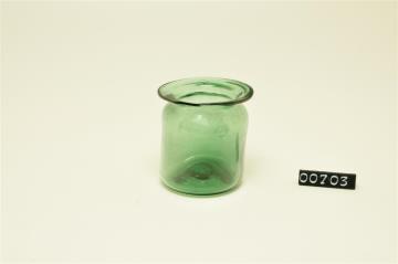 Hellgrünes, Fläschchen. Im Querschnitt rechteckige Wandung. Abfallende Schulter. Mündungsrand umgebogen.