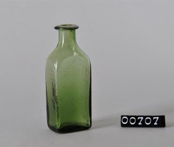 Enghalsflasche, vierkant, ohne Stöpsel, im Querschnitt rechteckige Wandung. Etikettiert.