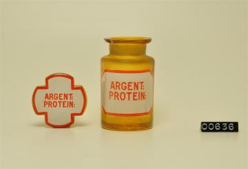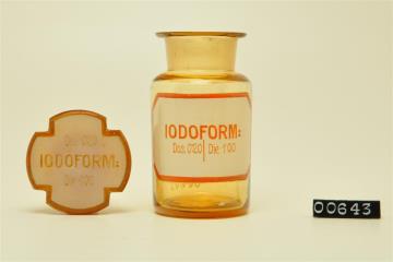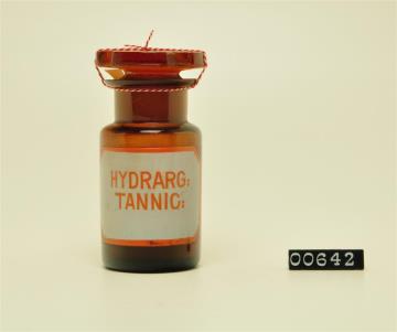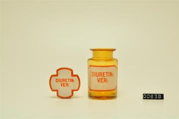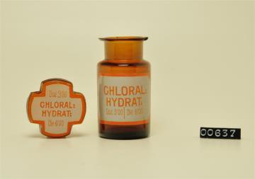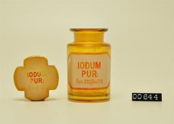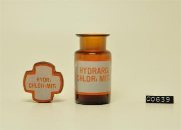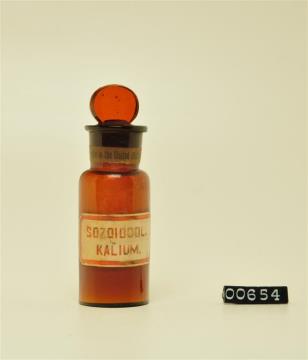 Rundes, hellbraunes Pulverglas mit signiertem Kreuzstopfen. Verdickter, abgeflachter Mündungsrand. Achteckiges, eingebranntes Emailleschild mit einfachem roten Rand und roter Schrift auf weißem Grund. Signiert