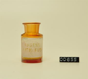 Rundes, braunes Pulverglas mit signiertem Kreuzstopfen. Verdickter, abgeflachter Mündungsrand. Achteckiges, eingebranntes Emailleschild mit einfachem roten Rand und roter Schrift auf weißem Grund. Signiert